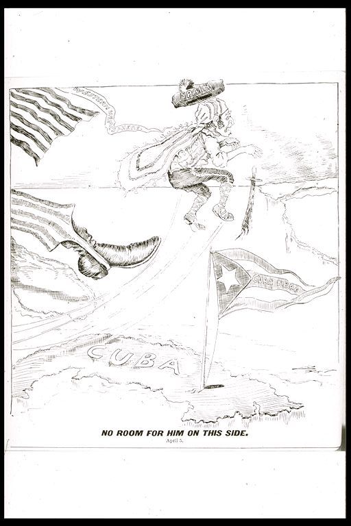 Cartoon. "No Room for Him on This Side." Uncle Sam boots Spanish pirate out of Cuba and New World. Minneapolis Journal. (April 5, 1898)